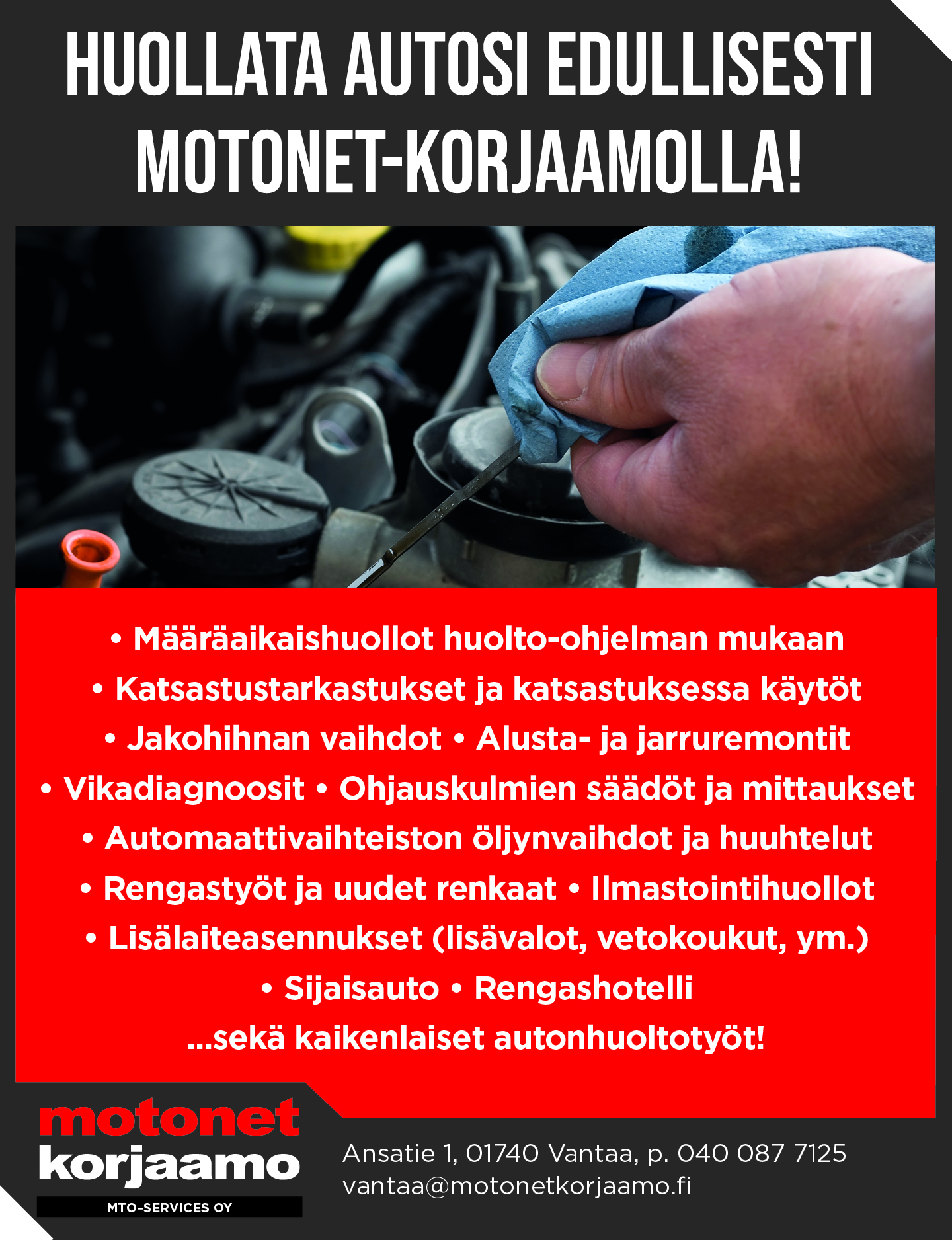 Nyt tuntihinta meillä 89€. Hakunilan kyläyhteisö Ry:n jäsenkorttia näyttämällä tuntihinta: 79€. Motonetilla on myös muita kiinteitä hintoja joista saa alennuksia jäsenkorttia näyttämällä.