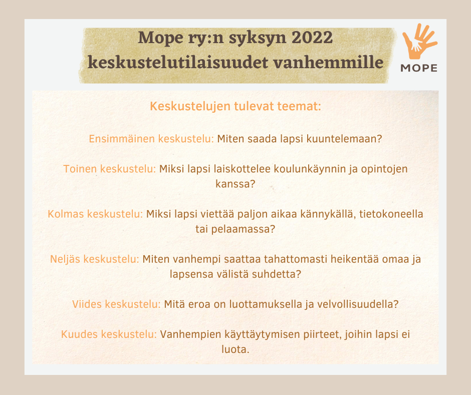 Mope ry on vuonna 2018 perustettu järjestö, joka toimii Itä-Helsingin alueella lasten ja perheiden hyvinvoinnin aktiivisena vaikuttajana. Mope ry tavoittelee yhteiskunnassa tilannetta, jossa maahanmuuttajaperheiden hyvinvointia sekä päihteisiin ja mielenterveyteen liittyvää tietoutta voidaan lisätä. Tuotamme tehostettua lastensuojelun perhetyötä maahanmuuttajaperheille sekä annamme tukea ja neuvontaa perheille, joilla on kehitysvammaisia henkilöitä.