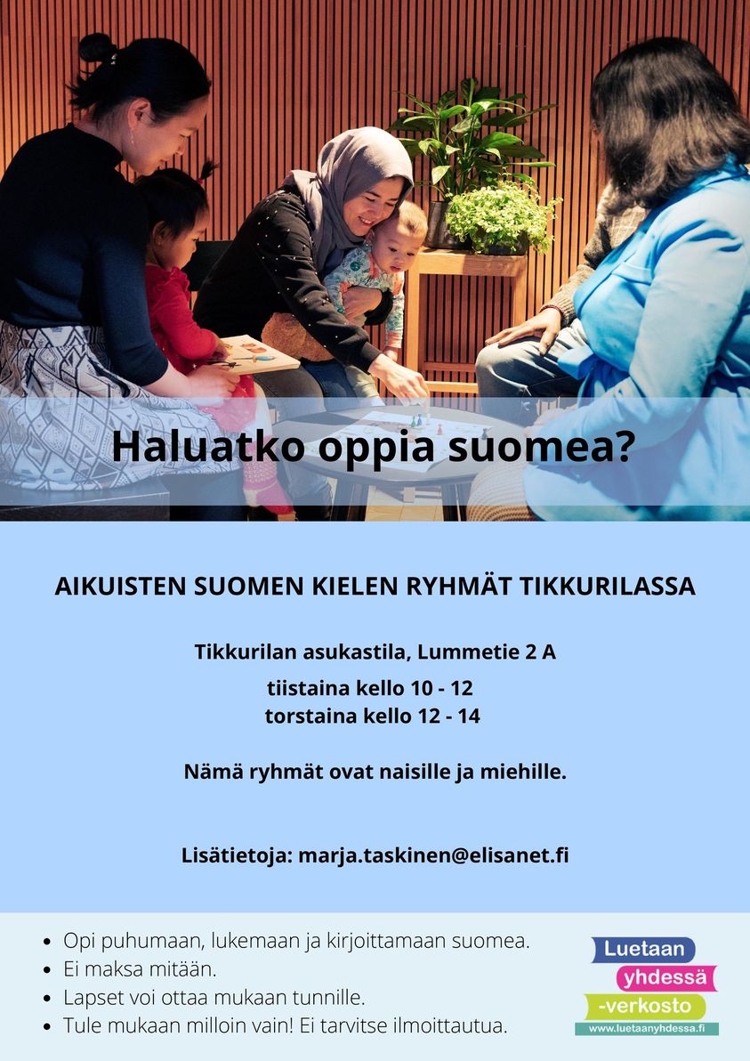 Tikkurilan Asukastilassa kokoontuvissa aikuisten suomen kielen ryhmissä on reilusti tilaa uusille opiskelijoille. Tervetuloa mukaan!Missä ja Milloin?