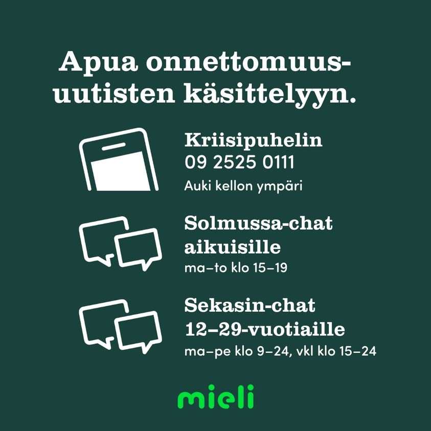 Uutiset onnettomuuksista voivat aiheuttaa ahdistusta. Muista, että keskusteluapua on saatavilla.