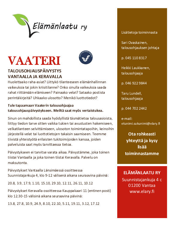 Vaaterin tavoitteet: Selvittää yksilötasolla taloudellinen tilanne ja tuen tarve puuttuen niihin syihin, mitkä ylläpitävät ja vaikuttavat talouden hallitsemattomuutta, esim. lisävelkaantuminen, päihteiden käyttö, pelaaminen, työllistymisen esteet, sosiaaliset tilanteet, aktivoiden asiakasta asioiden hoitoon.